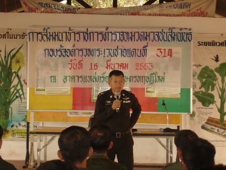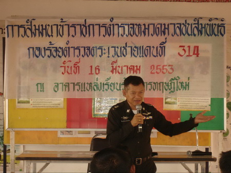 พ.ต.ท.ประกฤติ ยามานนท์ ผบ.ร้อย(สบ2)ฯ(ร้อย ตชด.314) ได้เปิดการสัมมนาข้าราชการตำรวจหมวดมวลชนสัมพันธ์ กองร้อย ตำรวจ ตระเวนชายแดนที่ 314 เพื่อชี้แจงและทำความเข้าใจถึงขั้นตอนการทำงานมวลชนให้ประสบผลสำเร็จ และการ ดำเนินงาน ตามโครงการ เสริมสร้าง หมู่บ้าน/ชุมชนเข้มแข็งเอาชนะยาเสพติดอย่างยั่งยืน ในพื้นที่ 4 ตำบล กับ 1 เทศบาล ของอำเภอฟากท่า และตำบลบ่อเบี้ย อำเภอบ้านโคก จังหวัด อุตรดิตถ์ |