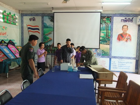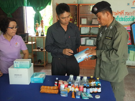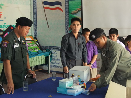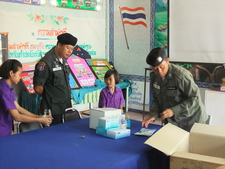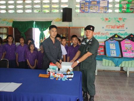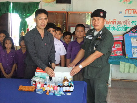 | เมื่อวันที่ 3 กันยายน 2553 ร.ต.ท.ประหยัด นามสุข ผบ.มว.ตชด.314 พร้อมด้วย ด.ต.แสวง เชียงทอง เจ้าหน้าที่พยาบาลร้อย ตชด.314 ได้นำยาเวชภัณฑ์ มอบให้แก่โรงเรียนบ้านนาหน่ำ ต.ฟากท่า อ.ฟากท่า จ.อุตรดิตถ์ เพื่อใช้สำั์หรับนักเรียนที่มีอาการเจ็บป่วย |